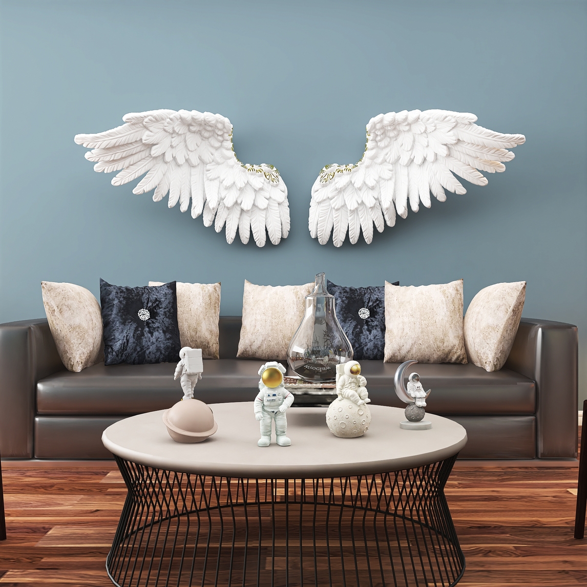 素雅的墙面,配合轻奢的墙面羽翼装饰,给人一种小清新的感觉,配上温馨的沙发,茶几上的几个太空人,无疑又是给场景增添了许多生机。