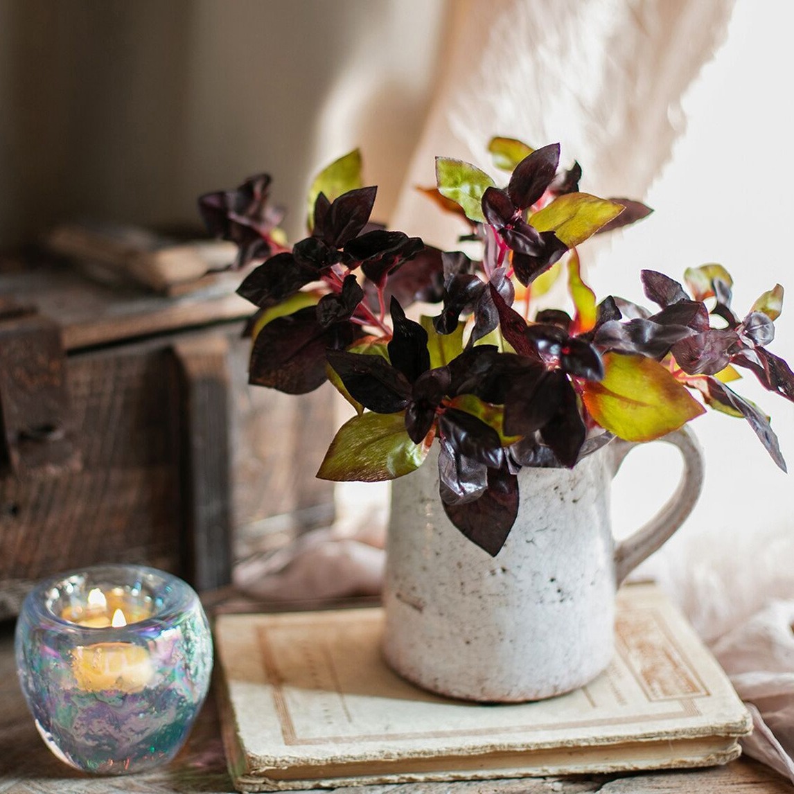 休闲的复古风书房,独特的紫苏叶与冰块质感的水晶烛台,搭配复古的开片陶瓷花壶,整个书房桌面空间变得更加雅致,简单的色彩,令书房更有味道。
