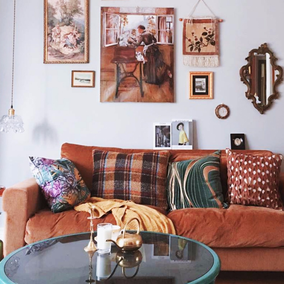 小户型的设计风格可以来一点小资情调的样子,墙面的装饰画选择抽象复古的欧式相框,沙发的也选择了简约的布艺沙发,沙发的颜色和装饰品尽量选择相似的,这样会更显有格调。