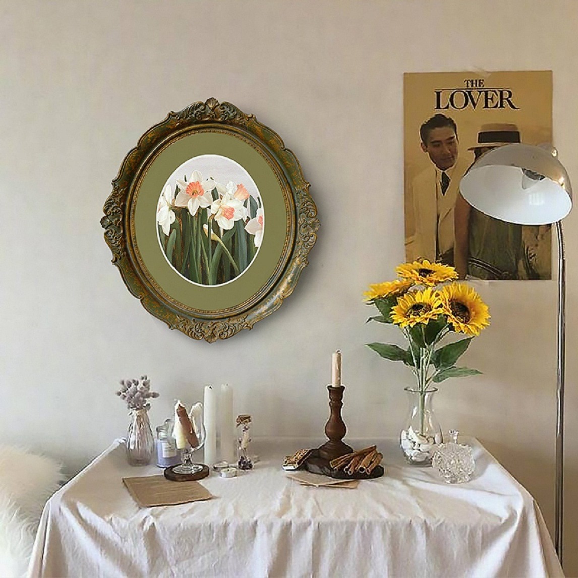 墨绿的色彩,充满的复古的质感,雕花的艺术,让相框充满典雅的欧式情怀,搭配上花卉的艺术创作,装挂在餐厅墙面,能使餐厅空间更加优雅有品。
