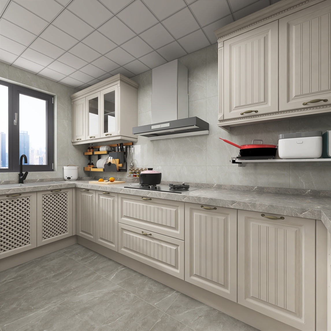 欧式风格,给人的感觉就是有种浪漫的气息。厨房装修欧式风格,用砖上选择的是当下流行的灰色的大理石瓷砖深浅灰,搭配米白色的欧式橱柜,在这里做饭也是一种享受。
