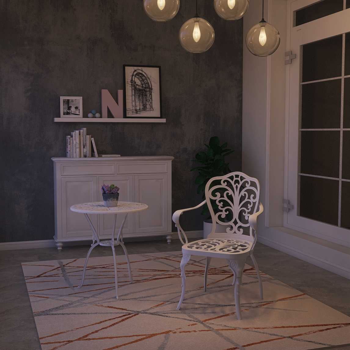 我们墙面才用了水泥自流平凸显出浓郁的工业风,白色的桌椅和墙柜清爽简单,与深色的墙面形成鲜明的对比。暖色的吊灯和地毯让这个空间温暖了许多!