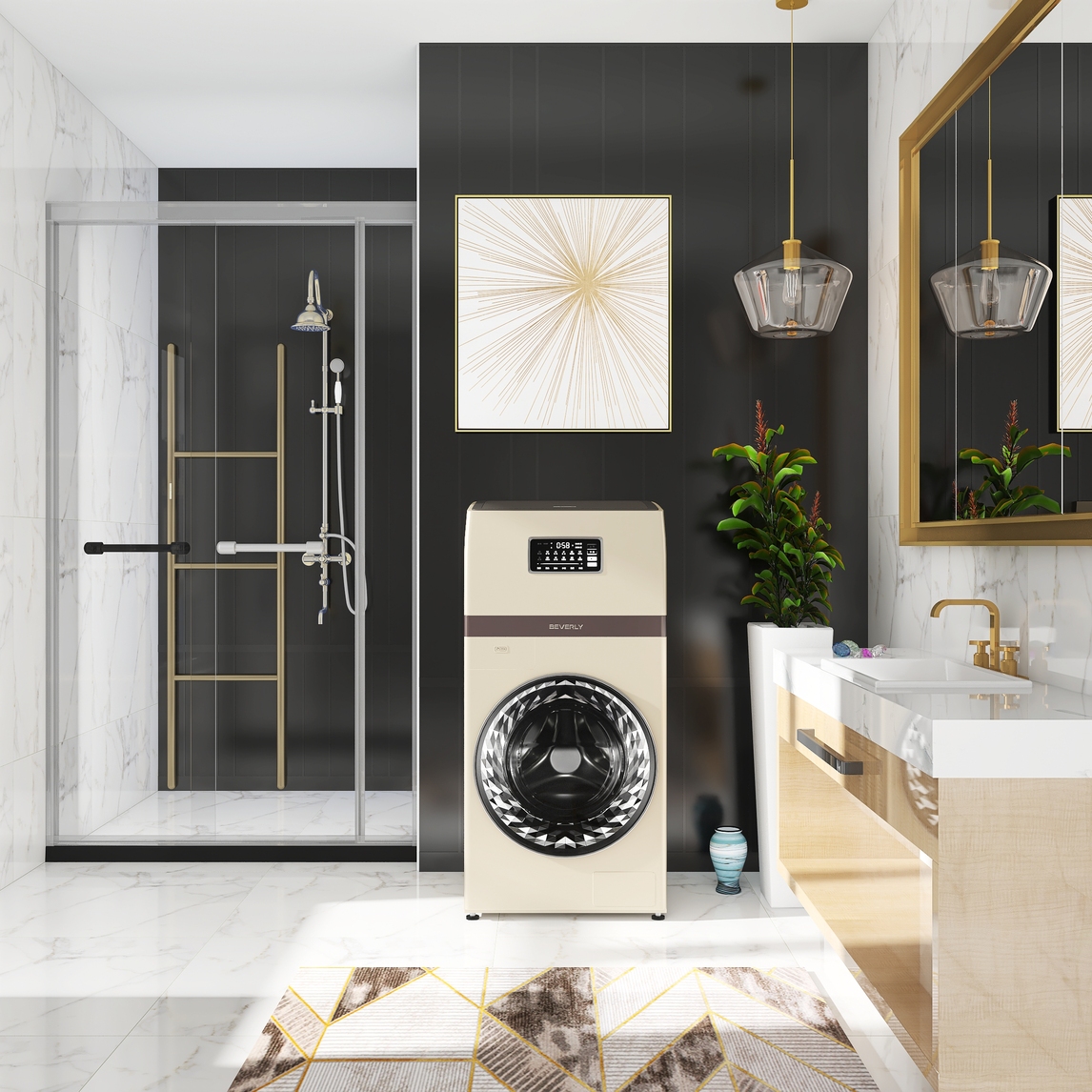灰色与白色的墙面对比鲜明,碰撞出卫浴间的时尚质感,独具一格的吊灯、装饰画和洗漱台都彰显着奢华精致的气质,共同打造一间轻奢风格的卫浴间,精致的15KG比佛利双层洗衣机,能够将大人和宝宝衣物分开洗涤,更安...展开