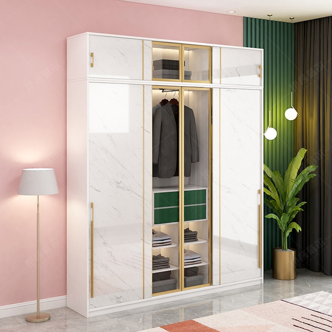 面板采用大理石纹理亮光设计,简洁大气,防爆玻璃柜门不易碎,安全设计放心使用,三个尺寸衣柜内部结构,分类收纳更有条理