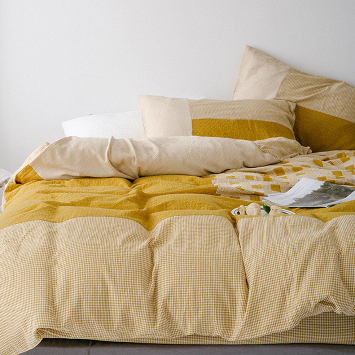 全棉双层纱面料,一般多用于婴幼儿纱巾中,柔软亲肤透气性好。面料由大格小格纯色十字图案的面料手工拼接而成,同色系不用的图案,看似随意又有整体嘎,工艺上也非常用心颜色采用低调的低饱和度,明媚的姜黄照亮空间...展开