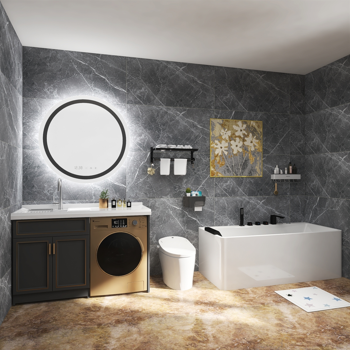 高端轻奢风格卫生间------高级灰色的仿古墙砖与金碧辉煌的地面映衬出高端卫生间的气氛,轻奢过功能浴室柜能把洗衣机一起融合,多功能浴缸与马桶齐驱并进。