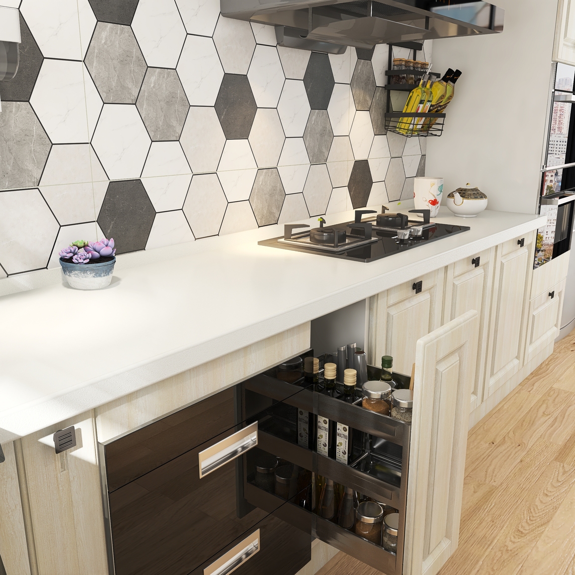 北欧混搭厨房----------艺术花格墙面另有一番风味,木纹瓷砖地面舒适防滑,各式拉篮置物架等等设备做饭做起来得心应手。