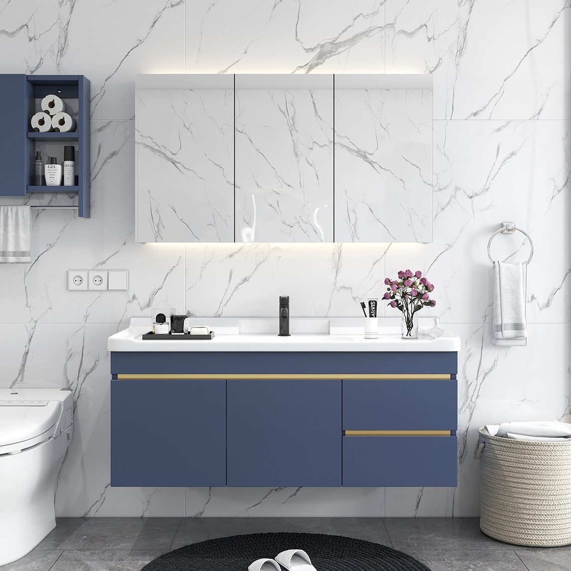 非常棒的一款轻奢北欧浴室柜组合, 镜子采用目前最流行的智能镜柜,在洗漱的同时掌握温度,时间等信息。 主柜方面用的是多层免漆板,健康环保,耐用。 台盆是一体陶瓷盆,易清洁打理。光滑细腻。