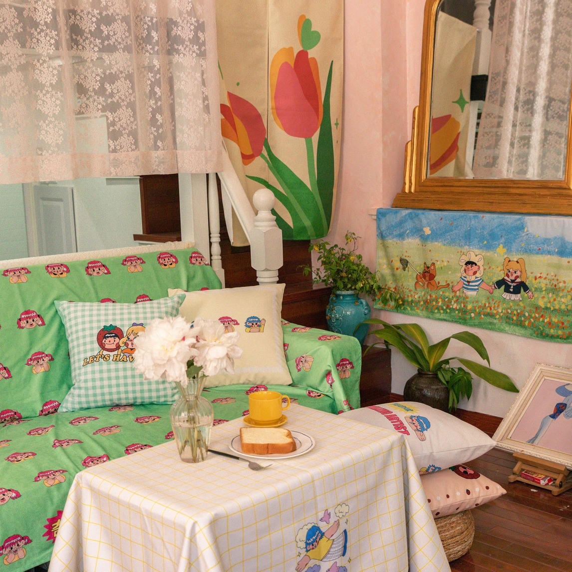 出租房旧旧的家具不能更换,铺上俏皮的桌布和沙发巾,瞬间增添了几分俏皮的色彩 配上卡通创意抱枕,关键时刻给你片刻的柔软