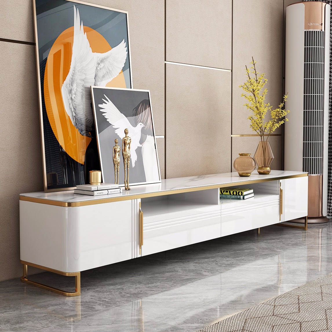 米色的墙壁搭配灰色大理石,打造出明净雅致的空间分文。岩板电视柜造型简约,加上不锈钢镀金搭配,轻奢大气,随便摆上一些挂画和摆件就艺术感十足。
