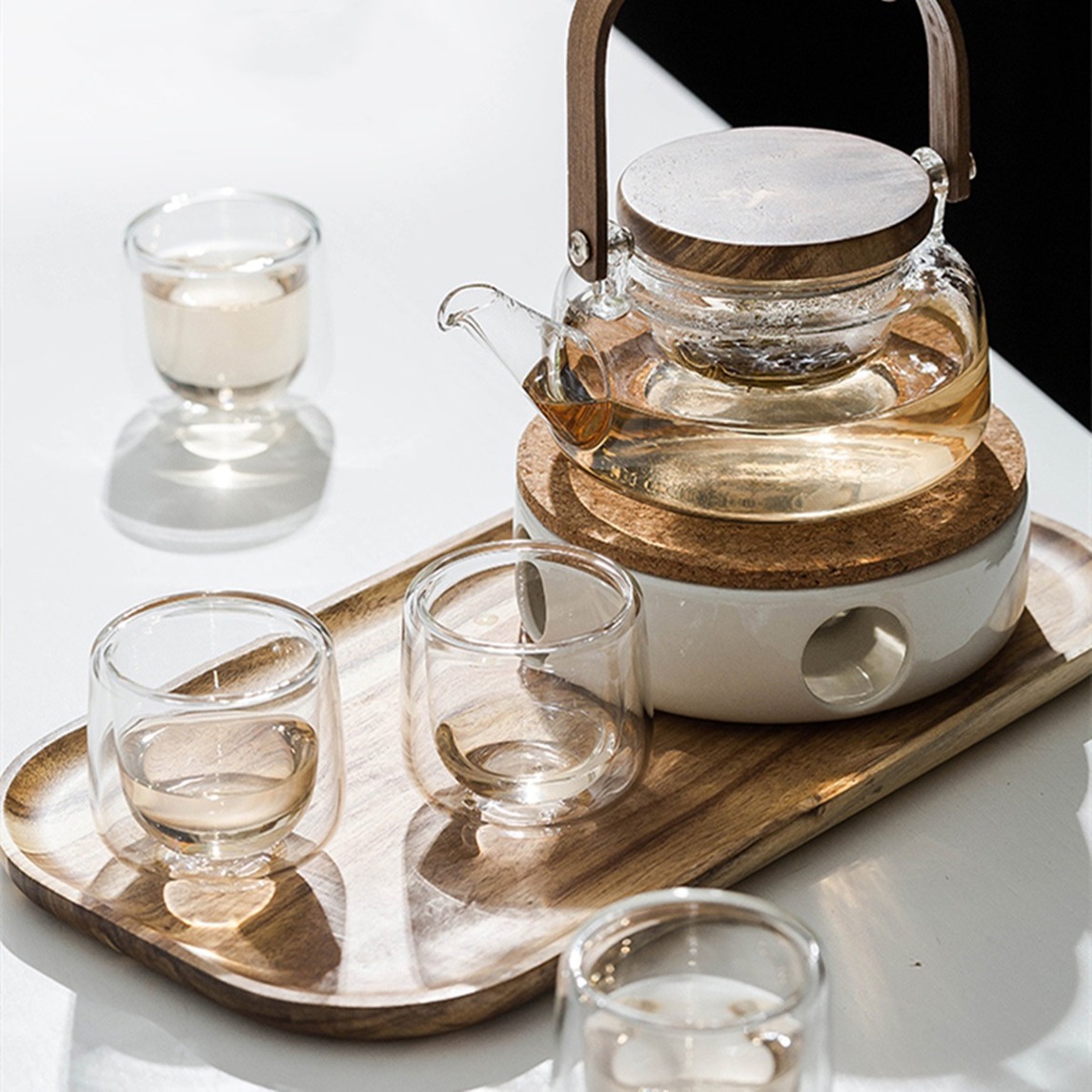 这组日式相思木茶具,将高硼玻璃与相思木结合,晶莹剔透又能耐热防爆,可爱的大肚茶壶有过滤茶漏,一套放在木托盘上颇有悠然茶韵。