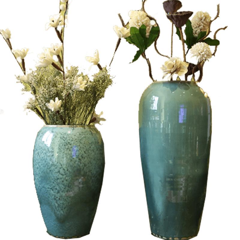 落地式陶瓷花瓶摆件,翡翠绿的颜色透露出自然之美,搭配天然鹅卵石和木质小栅栏,装点在客厅一角,意境唯美,体现着现代与古典的结合。