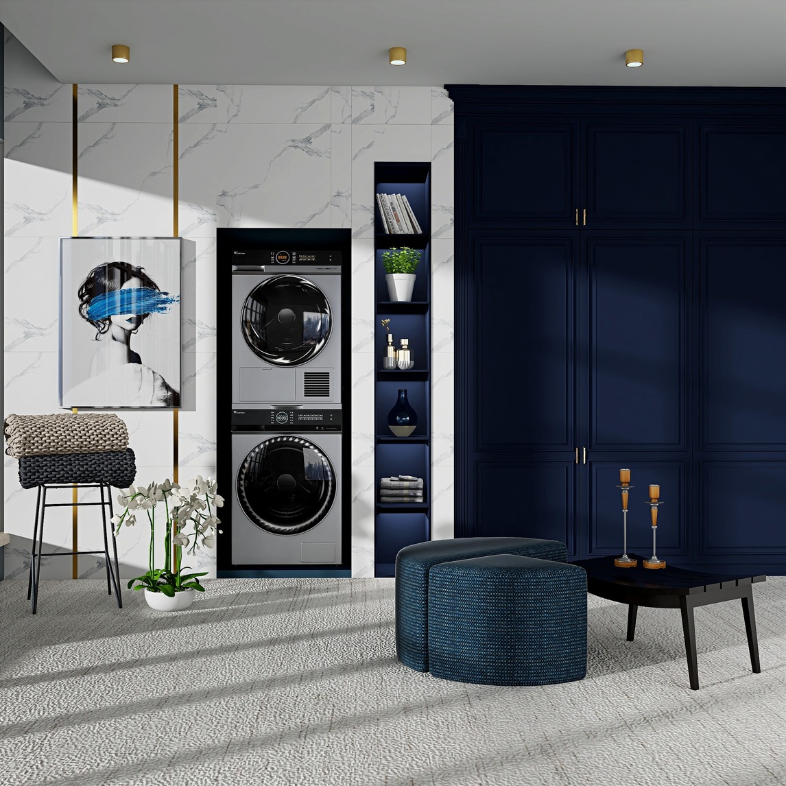 复古的衣帽间,主要选用白色和墨蓝色调,营造怀旧精致的居室环境,小天鹅洗烘套装的加入,增添了衣帽间的功能。10KG水魔方洗衣机和10KG除菌烘干机的组合,不仅拥有强大齐备的洗烘能力,还拥有高效除菌功能,...展开