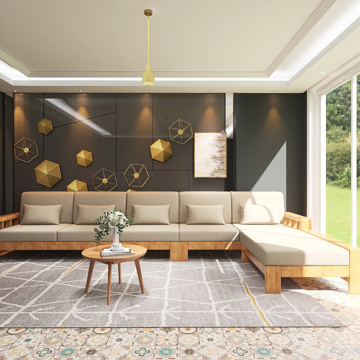 工业风的客厅选用了灰色调来设计墙面,加上抽象装饰画的点缀,为其增添了时尚个性色彩,另外客厅还选用了木质沙发与小茶几点缀,带来简约大方美感,而辅以带有几何图案的地毯,为简单的空间增添了别样艺术气息,