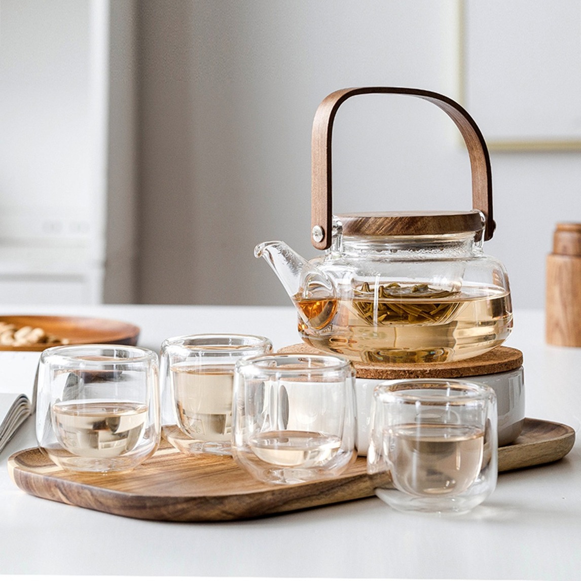 这组日式相思木茶具,将高硼玻璃与相思木结合,晶莹剔透又能耐热防爆,可爱的大肚茶壶有过滤茶漏,一套放在木托盘上颇有悠然茶韵。