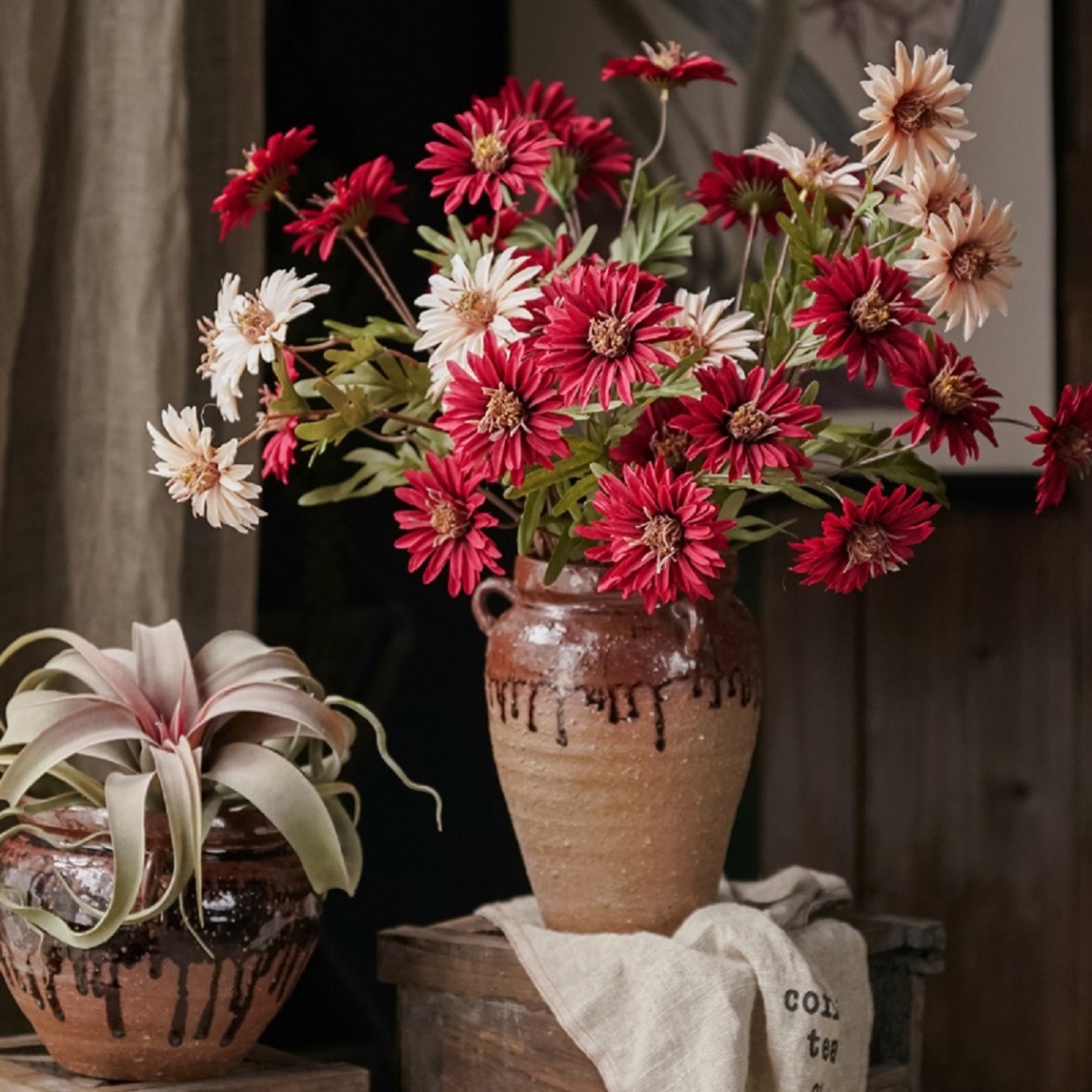 复古元素的运用,很容易走进人心,红色与白色的搭配花艺,温暖又充满生机,给阳台充满自然的气息,低调的简单美,让生活充满温馨。