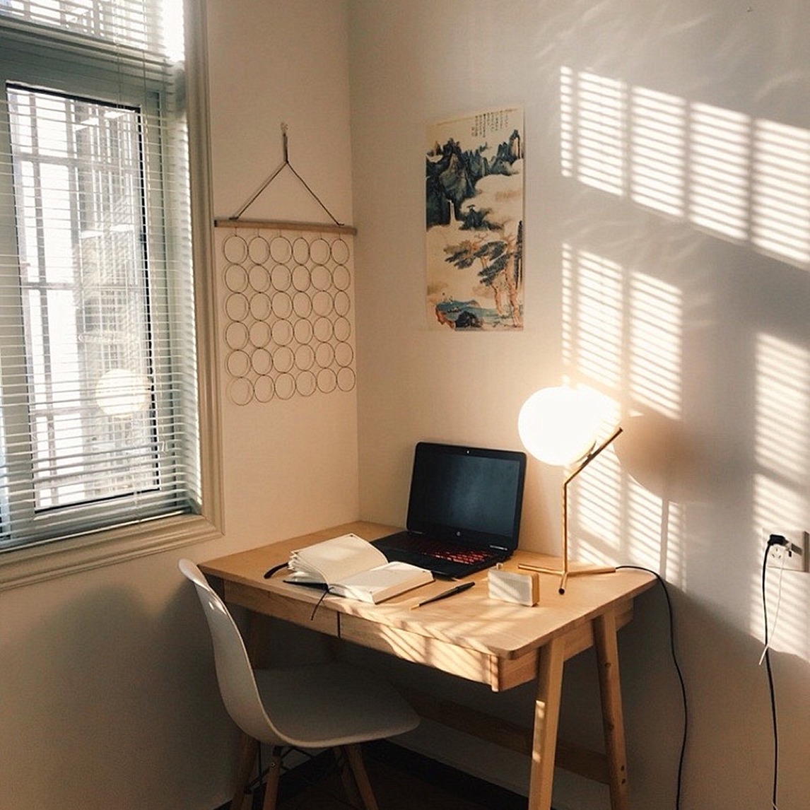 墙角放一张简约的实木书桌,大容量扁平式抽屉容纳平时收纳需求,实木材质结实牢固又耐用,搭配一把简单的伊姆斯椅子,轻轻松松打造一方工作学习的小天地。