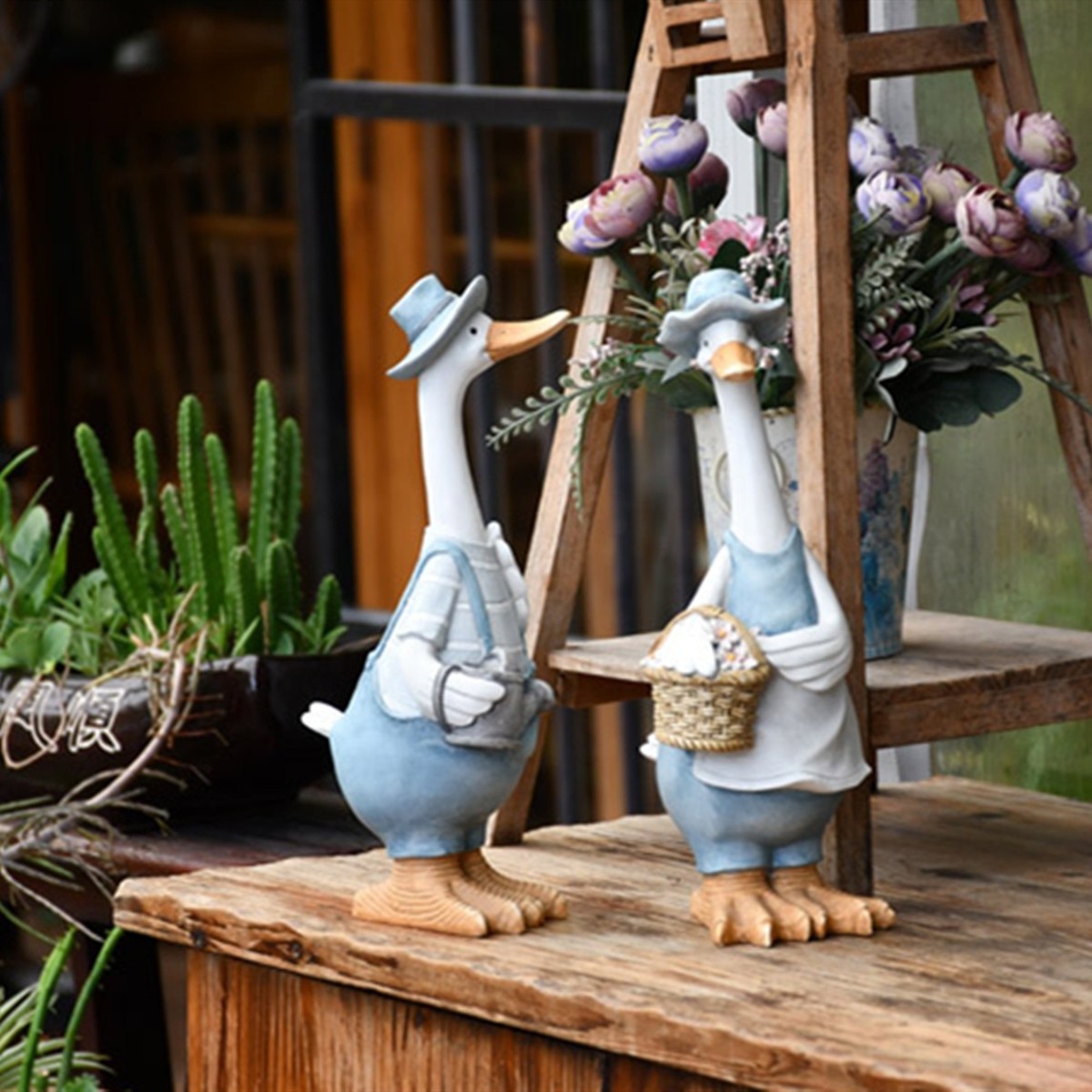 庭院夫妻鸭子装饰摆件,手提花篮和水壶,有着田园味道。形象生动,趣味十足,摆放在家里的任何地方都很养眼。