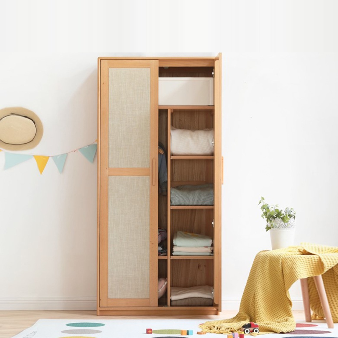 儿童的衣物总是摆放的很乱,所以这款儿童衣柜为孩子打造整洁轻松的空间,原木色泽清晰纹理给人清新自然视觉感,环保油漆健康材质尽显对孩子无微不至的爱。