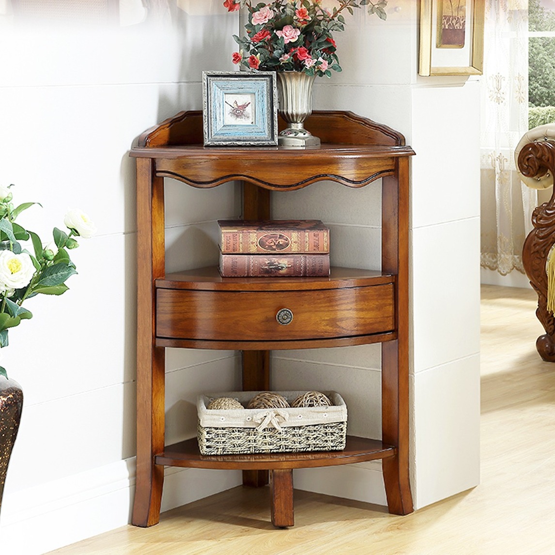 这款是美式古典、欧式古典风格的转角柜,在家里的小角落放置一个拐角柜,可以储物,也可以完全是一种装饰哦。