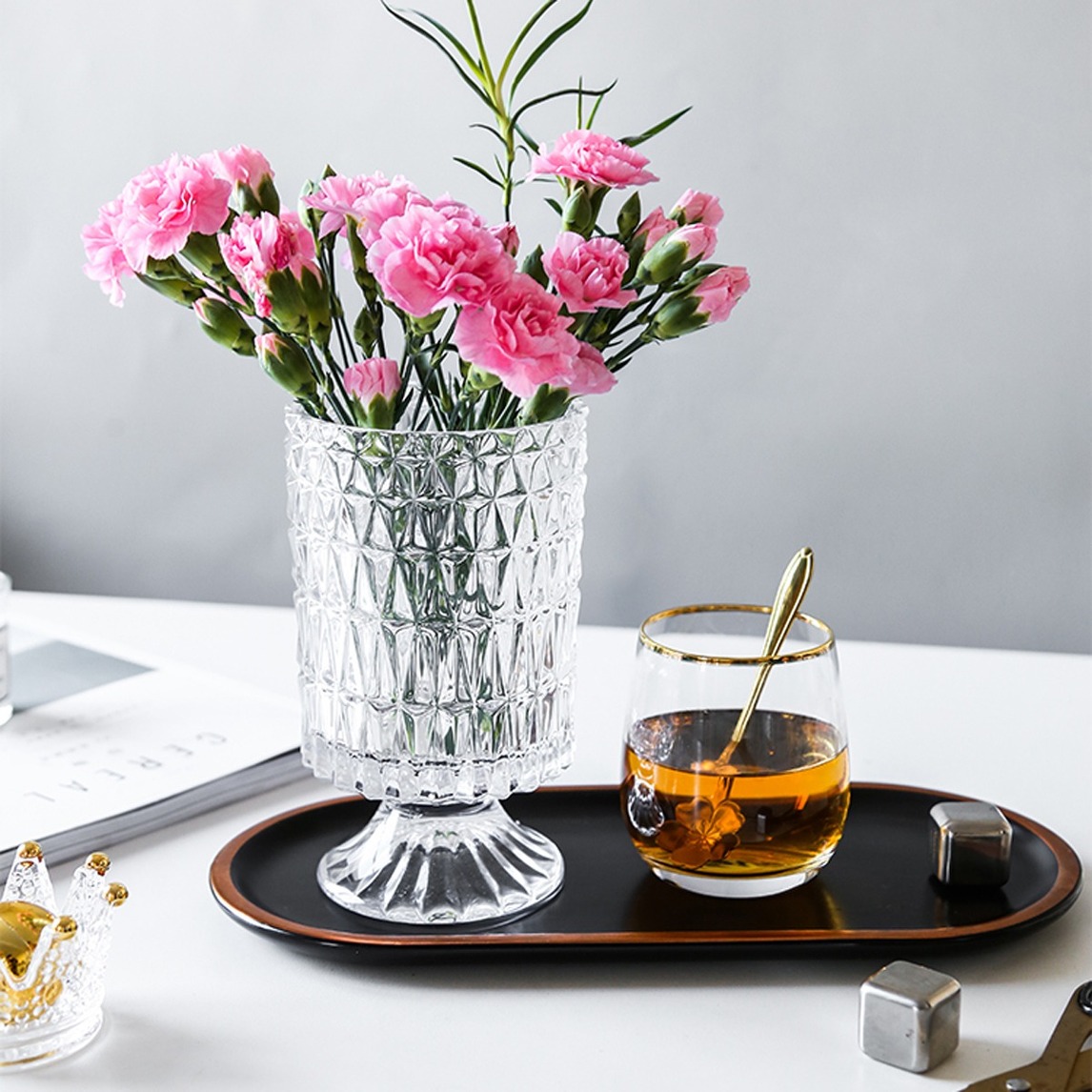 简约设计的玻璃花瓶,钻石纹点缀,看上去十分璀璨,插上一束繁盛的花卉,既增添了一片盎然生机,也提升了家居格调。