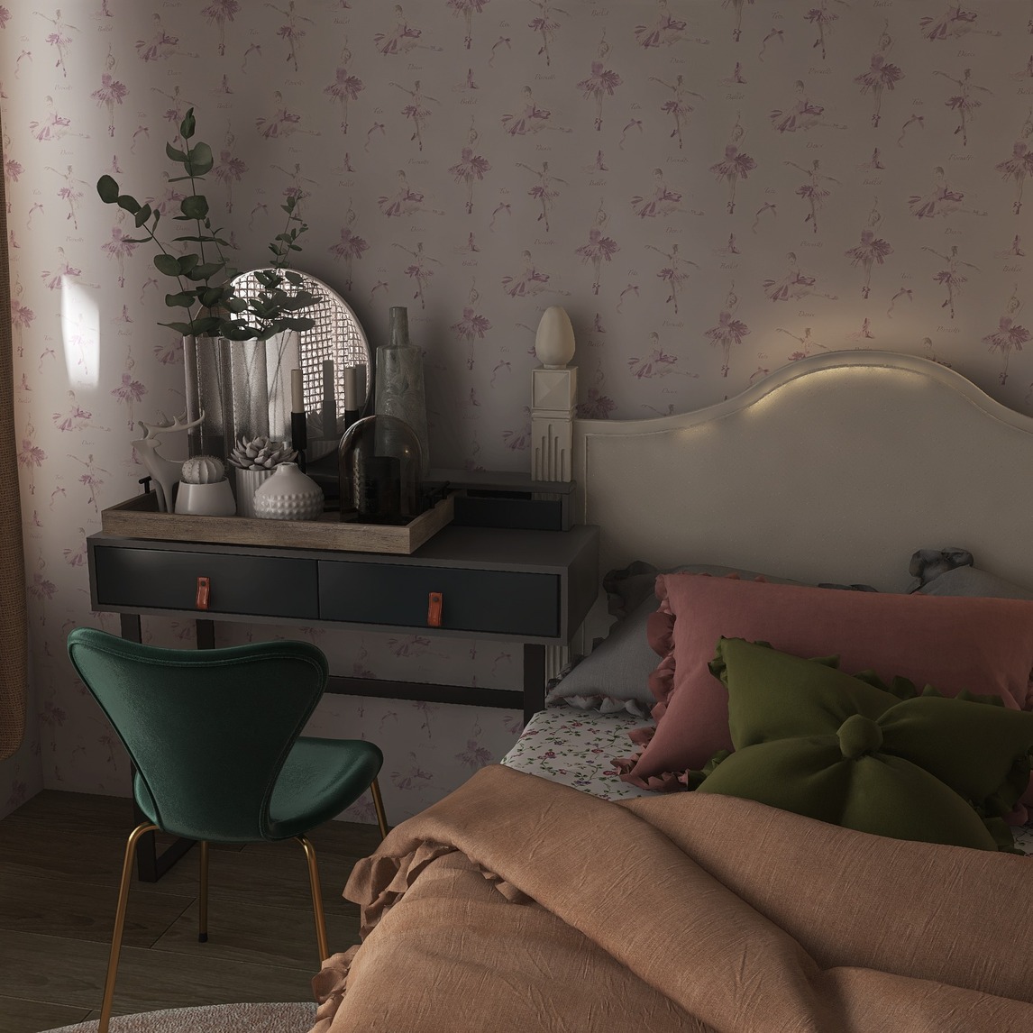 设计的是一个女孩子的房间,有简约和田园的组合形成了淡雅的一个房间有少女但是又吧失优雅,符合很大一个年龄阶段的需求