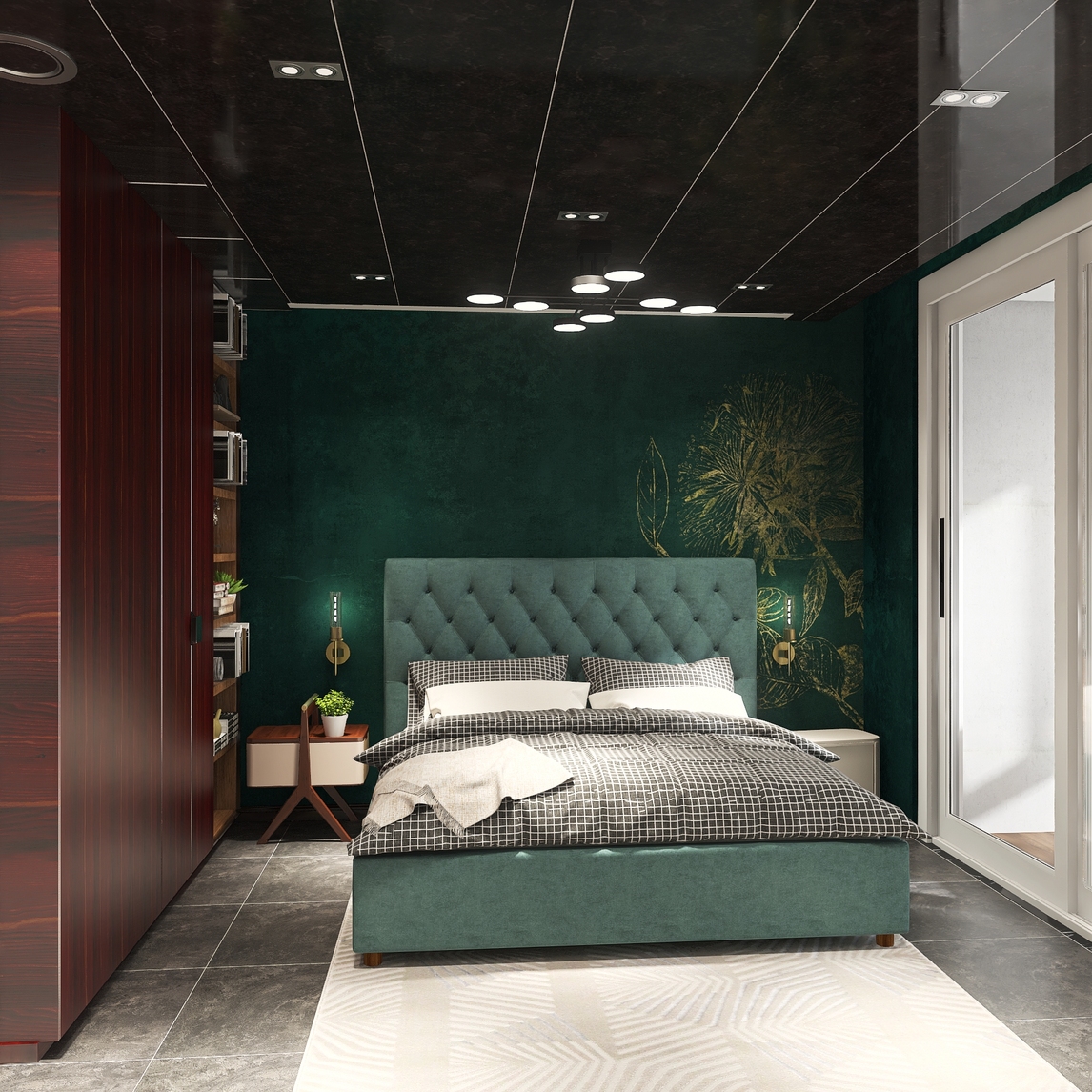 深绿的壁画加上淡绿的床,有种艺术气息。微亮的顶灯,休息能快速入睡。房间简洁中有种奢华,又不失艺术的灵感。
