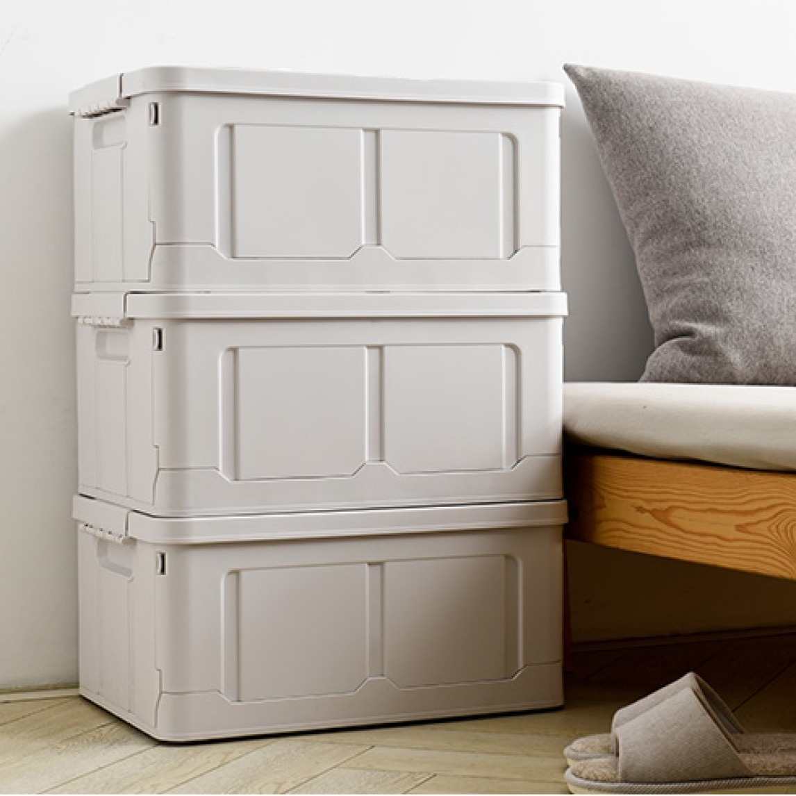 折叠收纳箱,采用环保PP材质,环保无异味。耐摔耐压,大容量,什么都能装。箱底加固,持久有效承重,收纳不含糊。叠加设计,垂直收纳,更省空间。