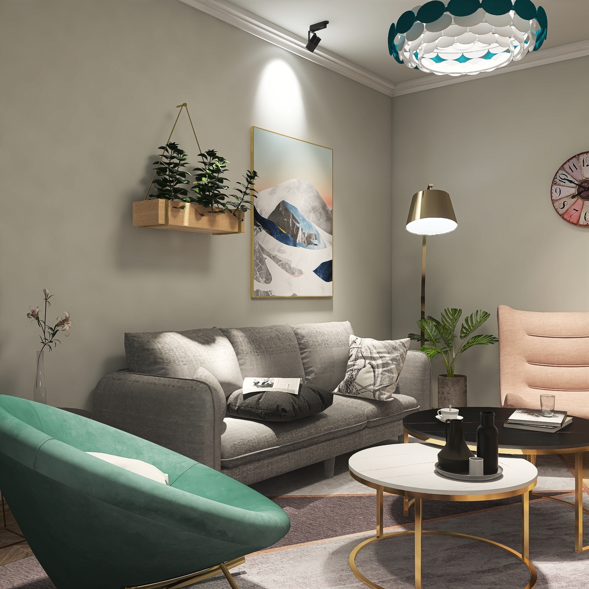 宁静、亲切的莫兰迪色系搭配出的淡雅精致的客厅区,小的空间给人温馨的居住享受,舒适休闲椅的墨绿与脏粉的碰撞,带给人慵懒闲适的居家环境。