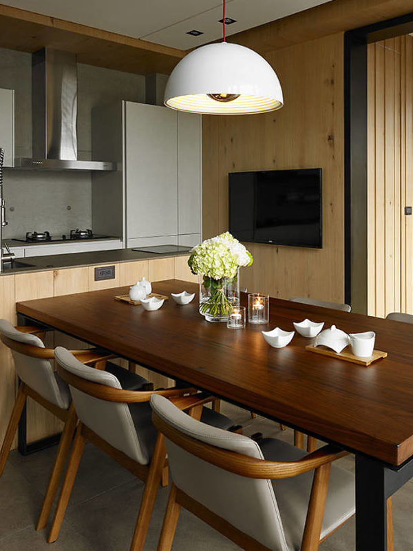 实木的餐桌餐椅,显得非常的素雅大气,深色的木色,非常的厚重,而白色的吊灯,则打破了这种深色调的沉闷感,活跃了餐厅氛围,营造出舒适的生活空间。