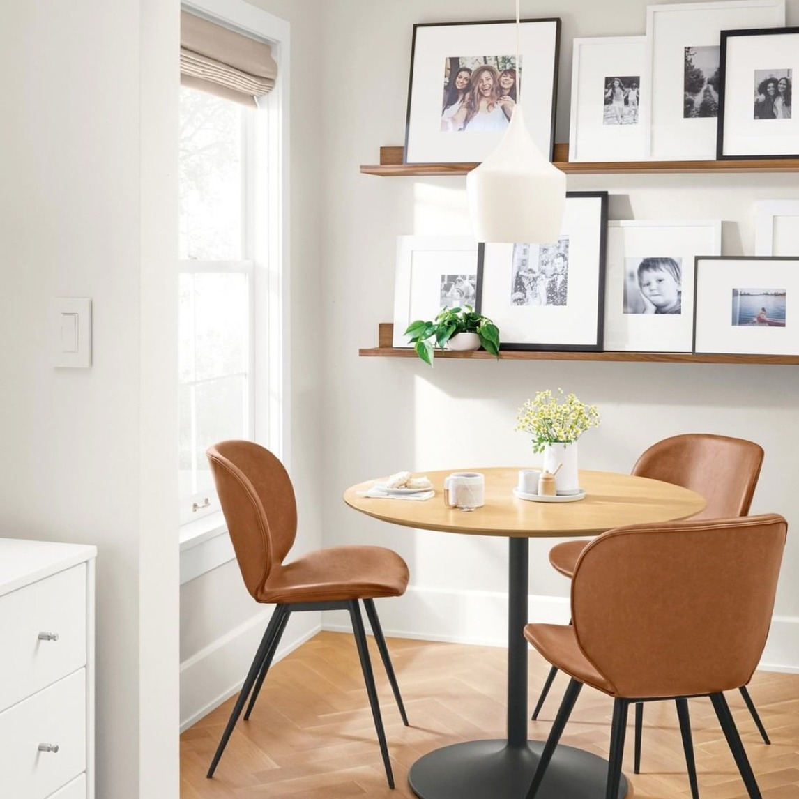 餐厅在营造的时候融入了咖啡色的元素,它可以与米白色家装实现元素上的对比,从而展现餐厅温馨而简约的生活气息。而且置物架上方还搭配了留白的装饰画和绿植,它不仅呼应了原木色的餐桌,还可以使餐厅更有层次。