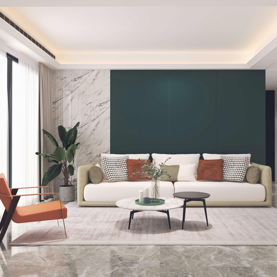 看惯了现代风格的黑白灰,偶尔需要不一样的颜色来冲击眼球。墨绿色——流行元素,我觉得它不仅仅是流行、也是经典。墨绿色的墙面将整个空间压下去。用橙色的休闲椅、抱枕来碰撞出活力的客厅。
