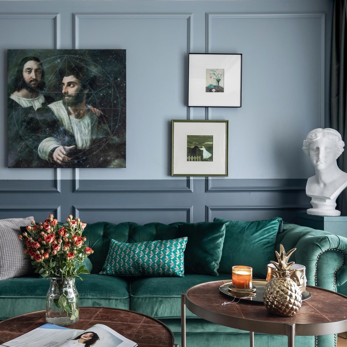 【原创设计 · Rolling空间设计】这是一套精装房改造,为了让硬装更佳饱满,在墙面上增加一些线条,用有色乳胶漆刷成两色,营造复古感。绿丝绒质感的沙发呼应墙上的画作,低调简约不失奢华感。高低错落的圆...展开