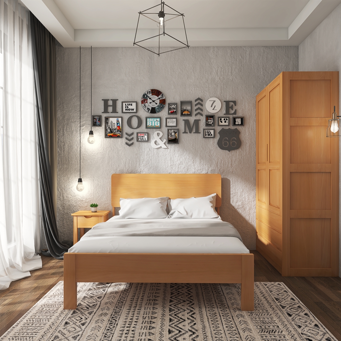 温润的原木材质。地面通铺木质地板,床头背景墙也选择了工业风水泥墙,让添加原木色元素更加能够使人感到自然和轻松!