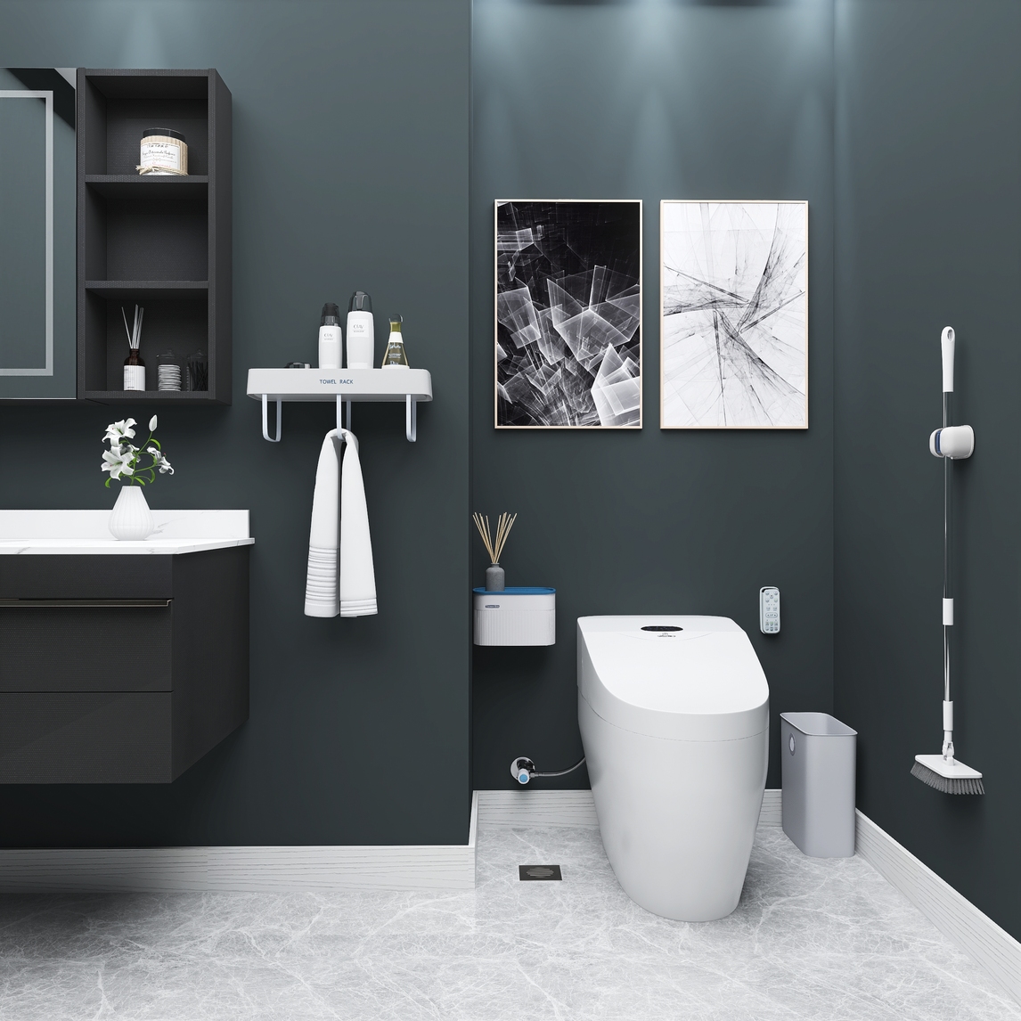 整体用墨绿色墙面背景,灰色条纹地砖,多功能毛巾架,挂毛巾也可以用来放化妆品等物品,青春角阀有品质有颜值,大号垃圾桶可以放更多垃圾,智能马桶使用起来更加舒适,拖把挂钩长久使用不掉落.