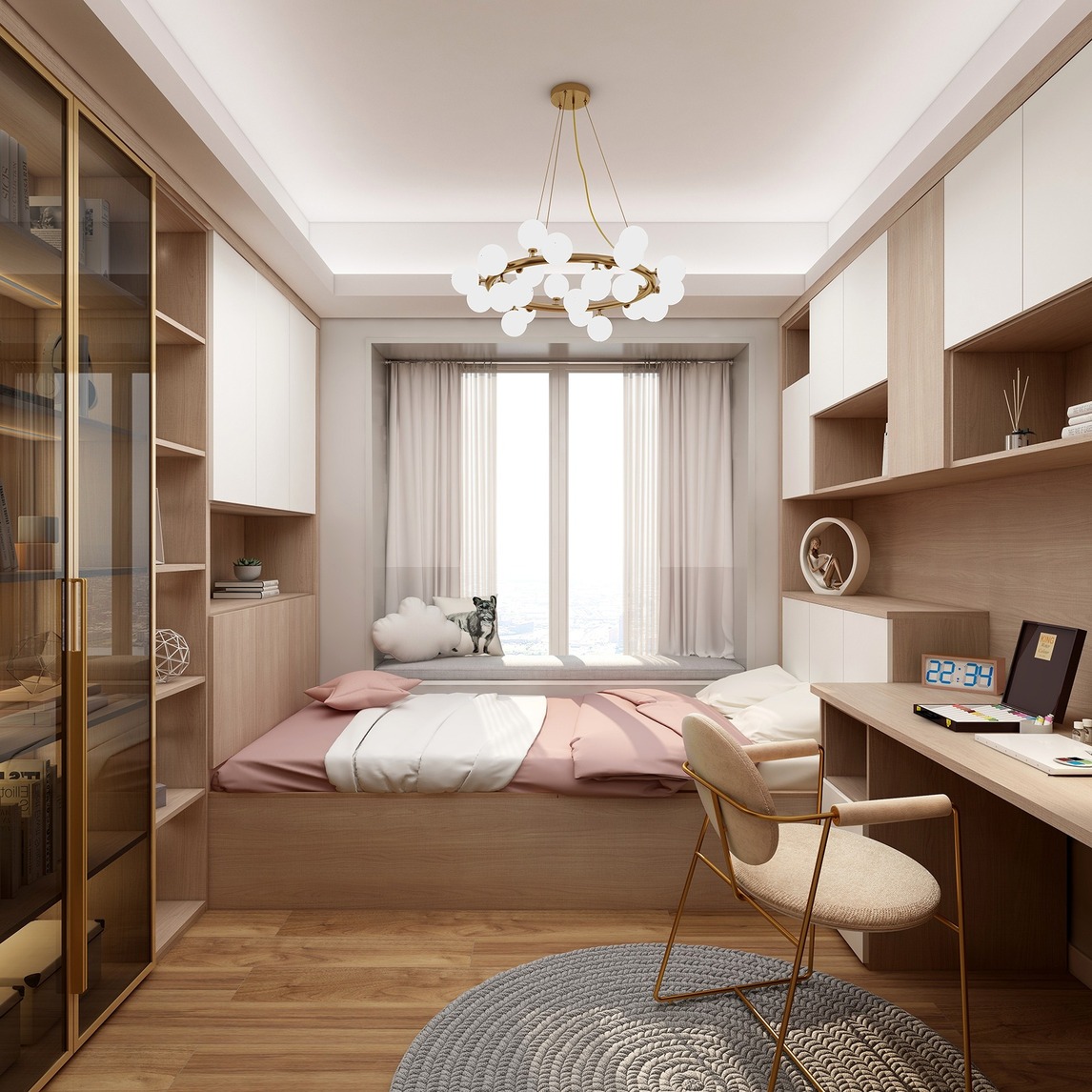 三居室户型总会有一间不到10平米的小房间,三口之家设计成榻榻米儿童房或者小书房再合适不过了。本案为榻榻米儿童房附带学习区,书桌和吊柜一体让孩子有学习的区域。左侧铝框玻璃门明亮通透,促使孩子能自行打理衣...展开