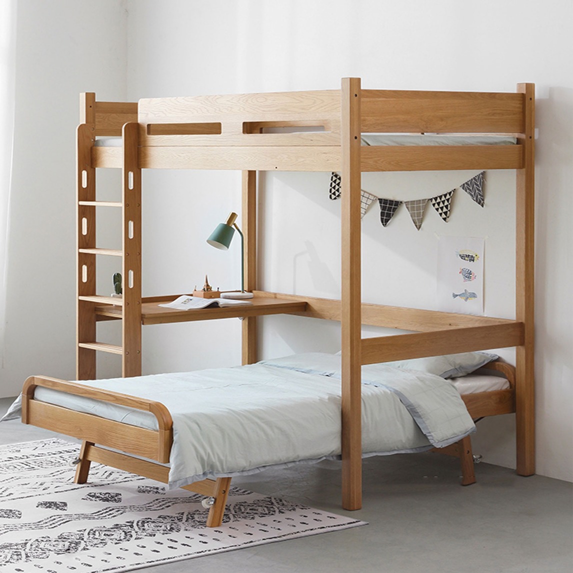 扶手设计简约好抓握,打磨光滑不会划伤孩子的小手,床头和床尾都采用大板的设计,稳稳的让孩子依靠着才安全,请让孩子远离床头镂空的儿童床。
