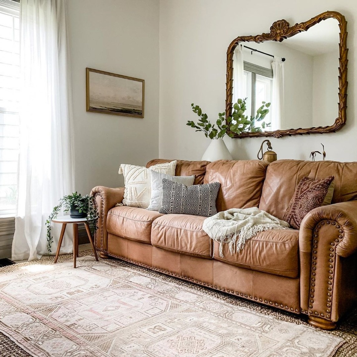 客厅以棕色和白色为主色调,加以真皮沙发和格纹风格的地毯点缀其中,从而营造出了素雅复古的生活氛围。墙壁上面的装饰画不仅能突出客厅的层次感,还可以呼应薄纱窗帘和抱枕,让整个房间显得更有格调。
