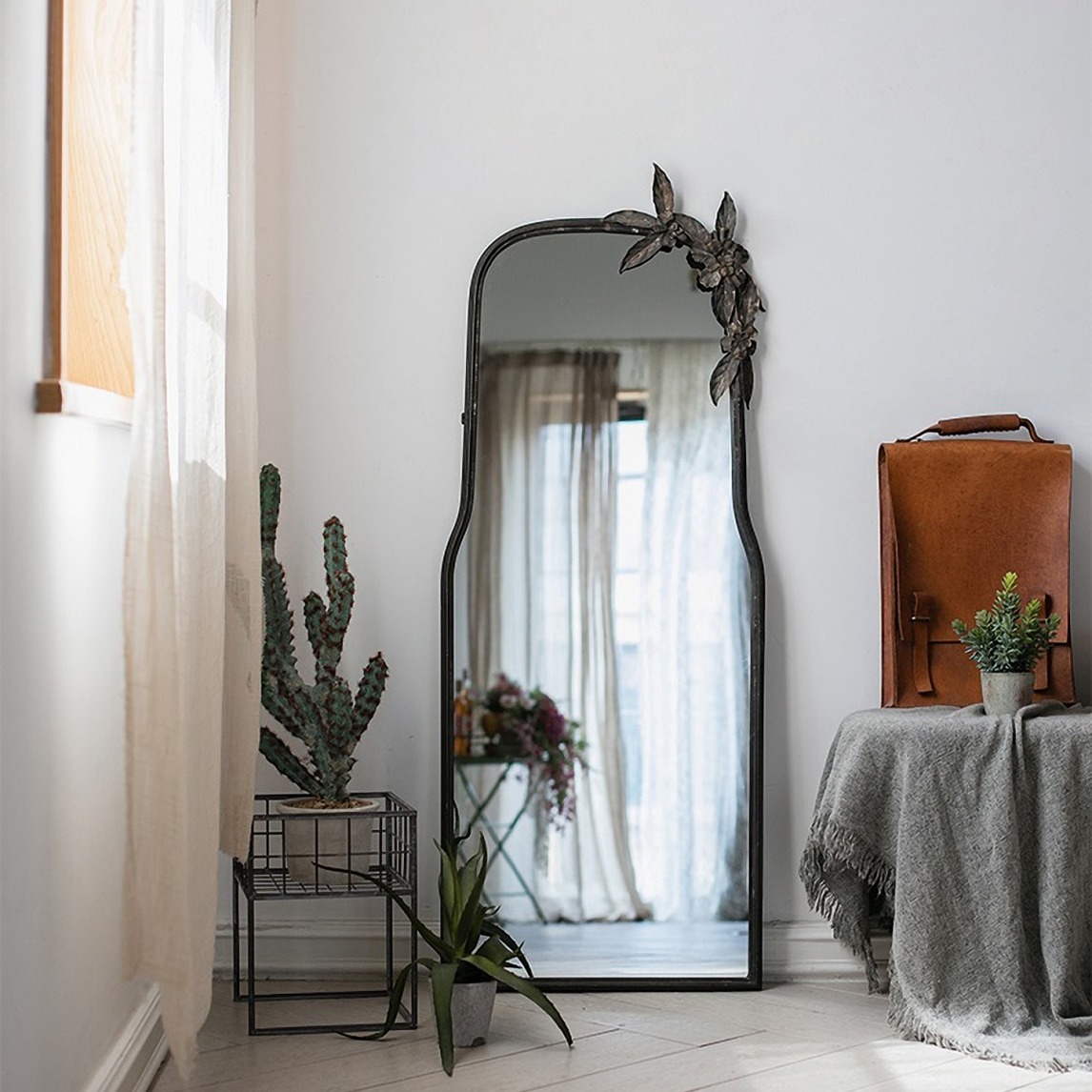 黑色调有着旧旧的沧桑感,雕花设计的落地镜充满欧式复古风情,多功能铁艺收纳花架特意地做旧,放入自己喜欢的花艺瞬间提升空间格调!