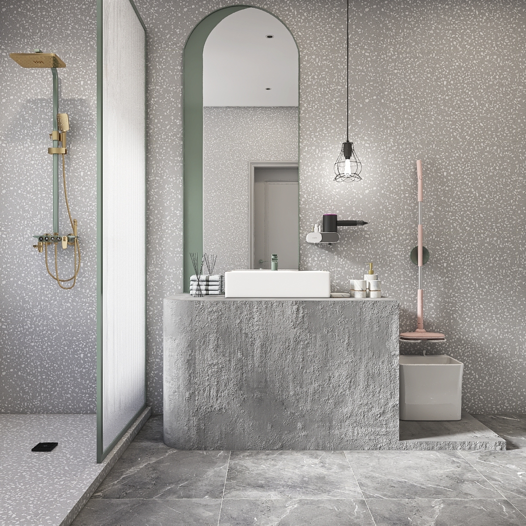看遍了千篇一律的常规浴室,不妨体会一把高级灰的个性浴室装修。整个空间以灰色瓷砖打造,洗手台则是毫无装饰的原石水泥砖。分隔屏和花洒点缀马卡龙绿,跳脱却吸精。