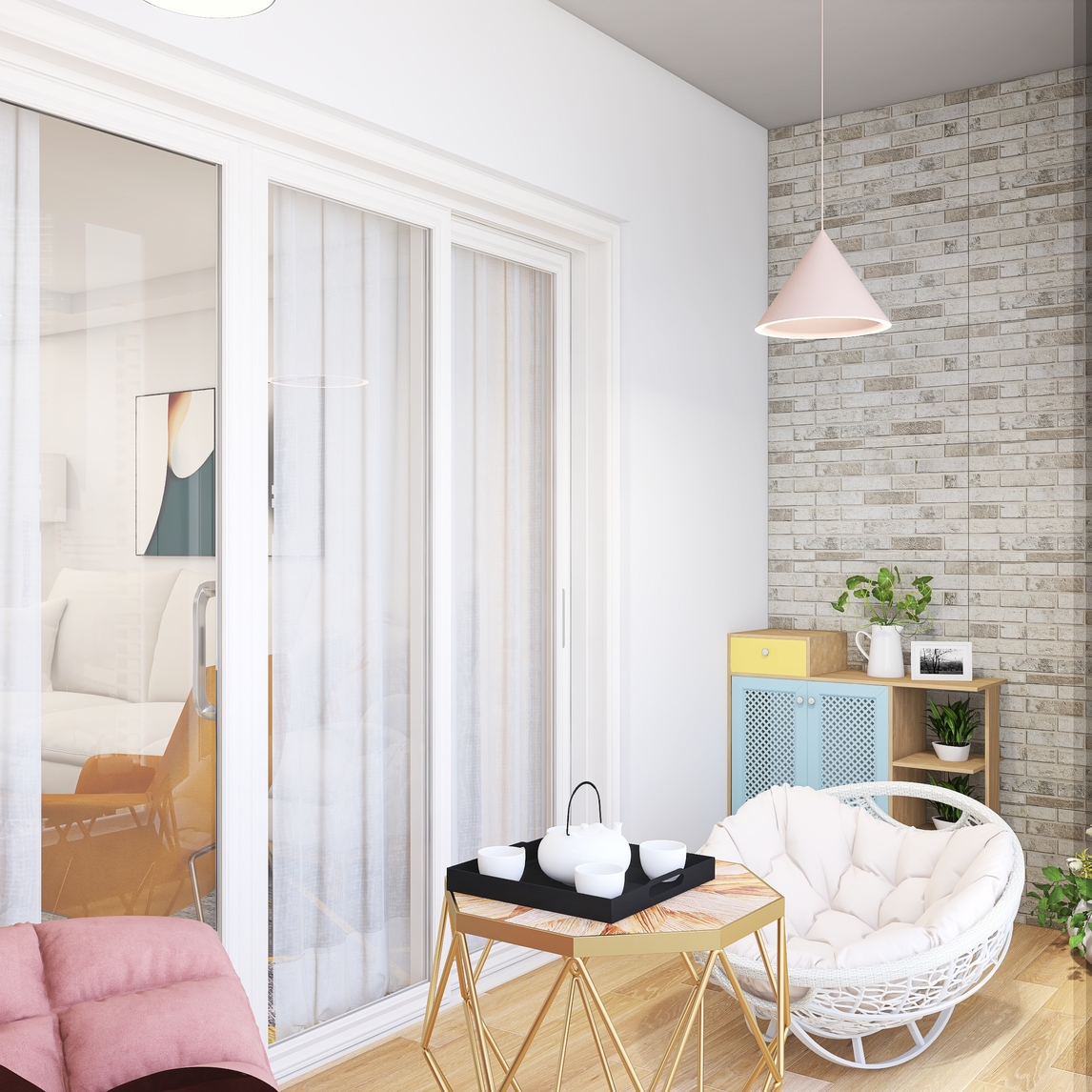 阳台是居家必不可少的休闲场所,木色地板和简约的北欧茶几,加上一些简约的花艺装饰,砖块背景墙显得整个空间温馨舒适。