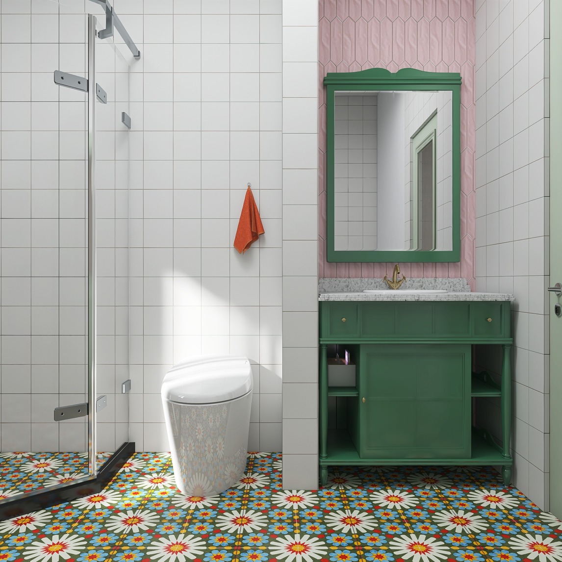 最流行的卫生间空间摆放,分隔有序,以绿色调为主的网红浴室搭配。地面复古小花砖,墙面拉槽小白砖,洗手间台背景墙再做一个异型砖造型,空间太好看了