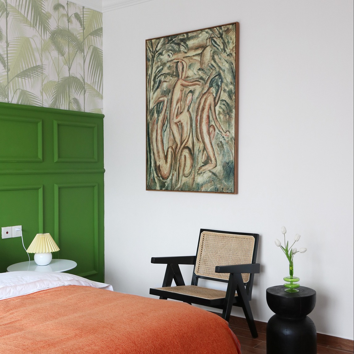 【原创设计 · 不造设计王小贱】卧室要怎么样设计才有春天的味道呢?我选择了在床头背景墙用草绿色的热带植物壁纸和绿色涂料组合成一副绿意盎然的画面,这是春天偏黄的嫩草绿,不是夏季的深绿,要注意色相的选择。...展开