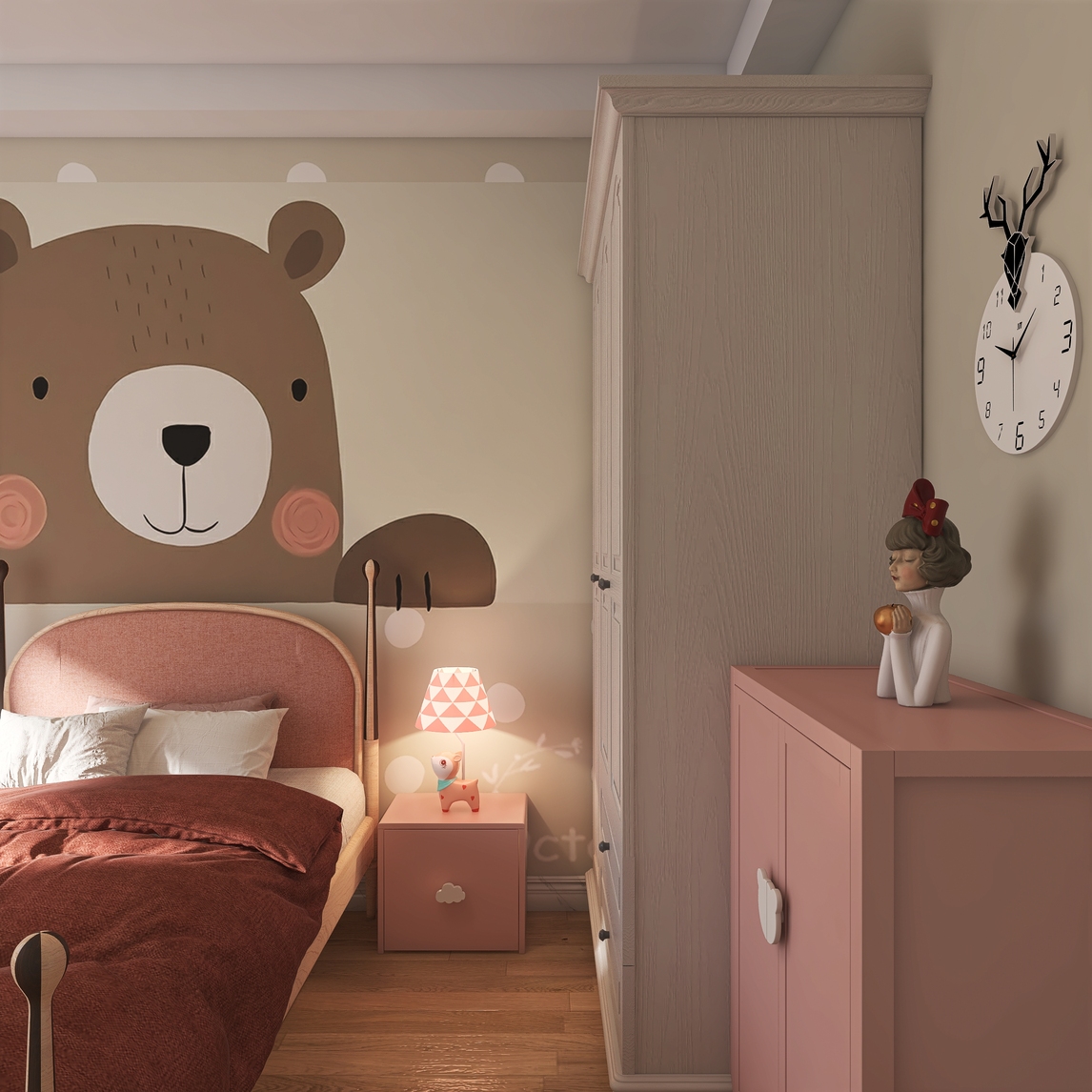 每一个孩子心中都有一个童话;梦幻,纯真,我们家庭设计中一定要给他们一个属于自己的小天地。暖色的墙面,搭配小熊定制床头壁画,仿佛宝贝每天在小熊的拥抱下轻轻入眠;搭配小鹿台灯,空间轻快又活泼。还有墙上的鹿...展开