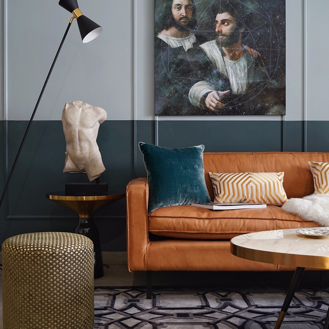 【原创设计 · 设计师sweetrice】客厅采用石膏线条加分色的处理,墙色选择了深灰绿+浅灰蓝的搭配,和棕黄色皮沙发形成撞色,深灰绿可以有效的降低对比色搭配中带来的视觉油腻感,使整个空间气质更为沉稳...展开