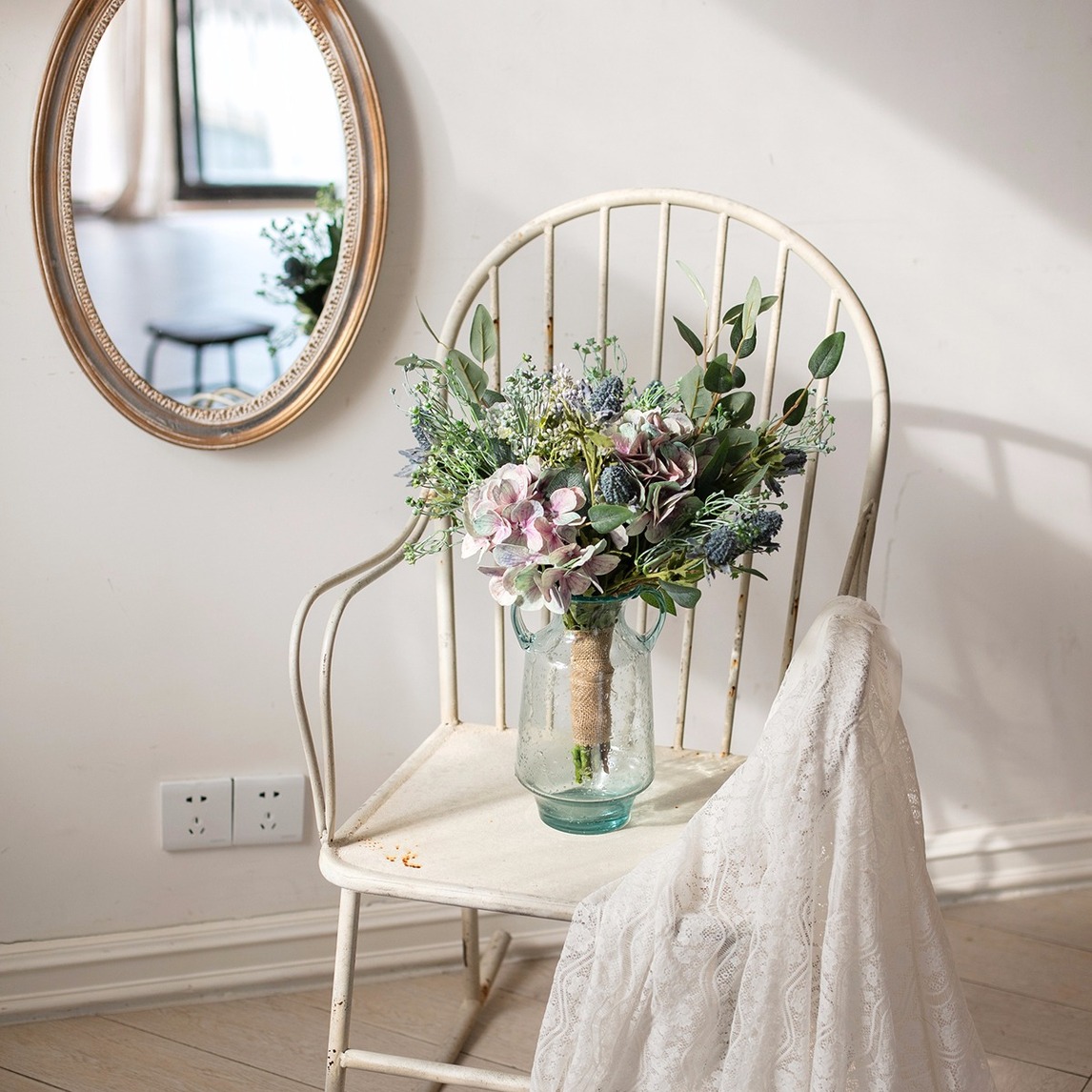 复古的铁艺躺背椅,带着斑驳的痕迹,摆上一束仿真花,三三两两的植物与花朵相组合,质朴而美好,闲暇时光倚靠在这,也是一件美事。