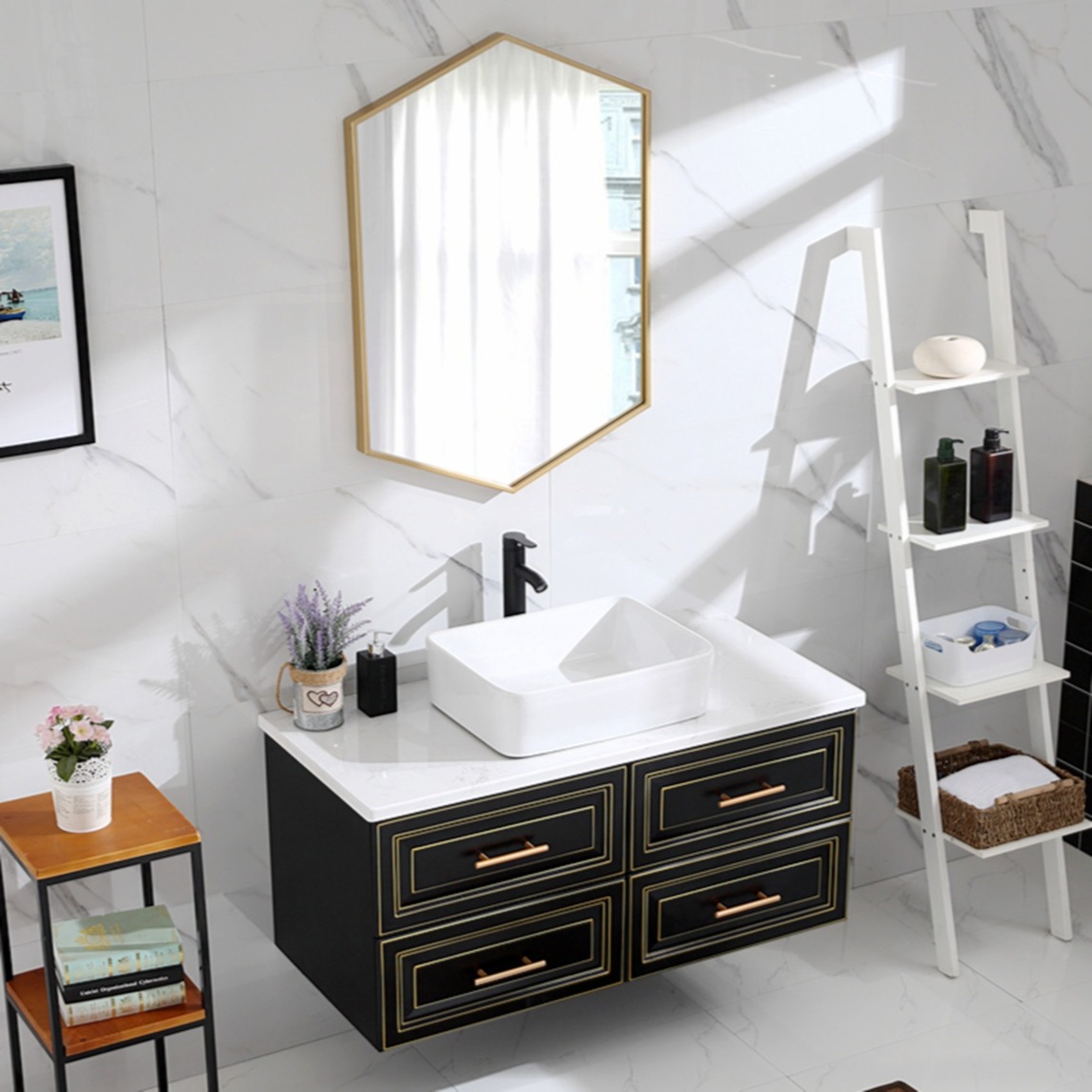 轻奢浴室柜,时尚的外观,看到就会被吸引。智能除雾led灯镜,还原美丽妆容。 简约置物架,梯形设计,占地面积小,置物更方便。 简约瓷砖,大理石纹理,跟浴室柜更搭。
