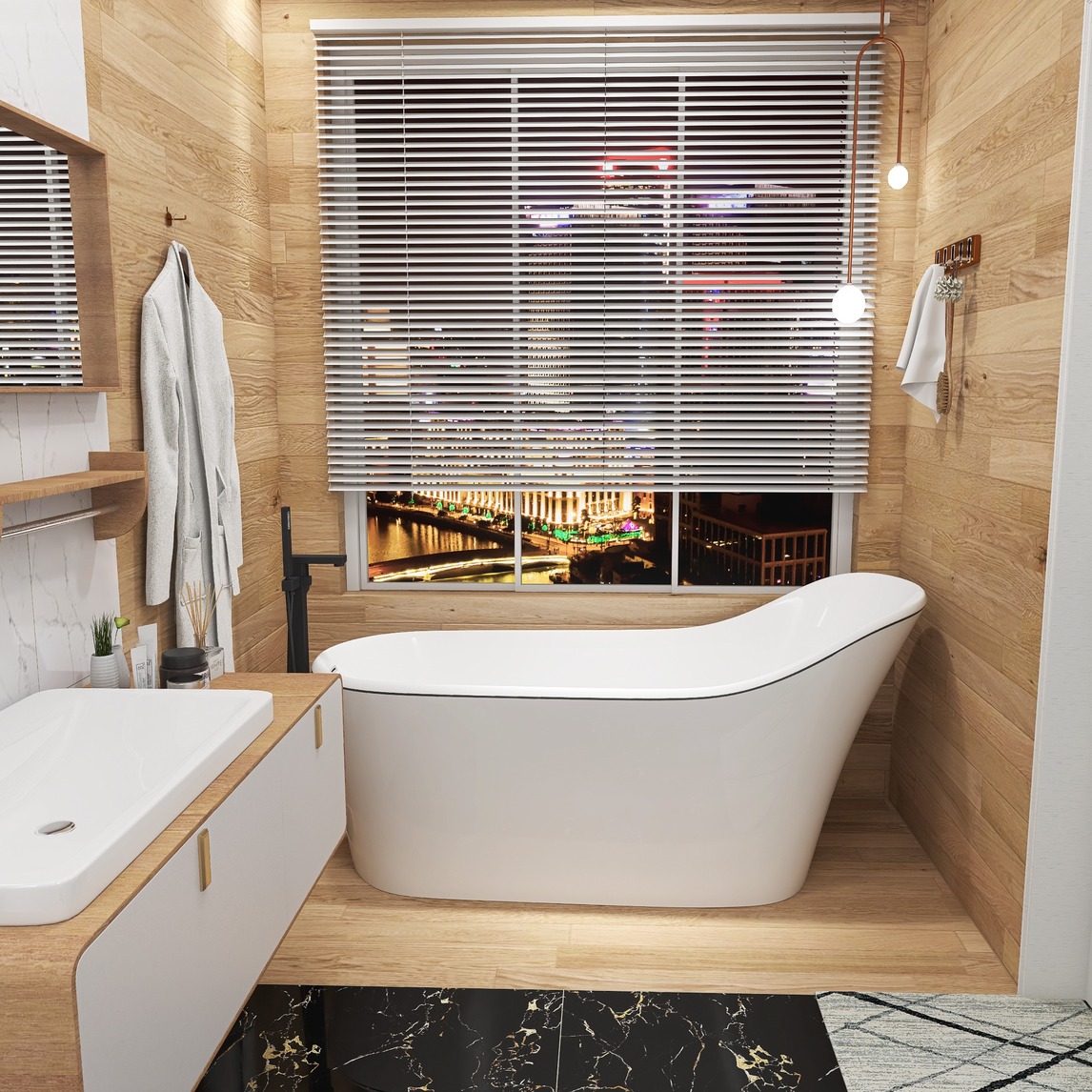日式风格卫生间设计,意在传递一种轻松自然而淳朴的氛围,用轻声缓述带有禅意的慢生活。浴缸搭配原木展示出的质感,带你回归纯粹的本质, 营造出一个舒适、轻松惬意的泡澡空间。
