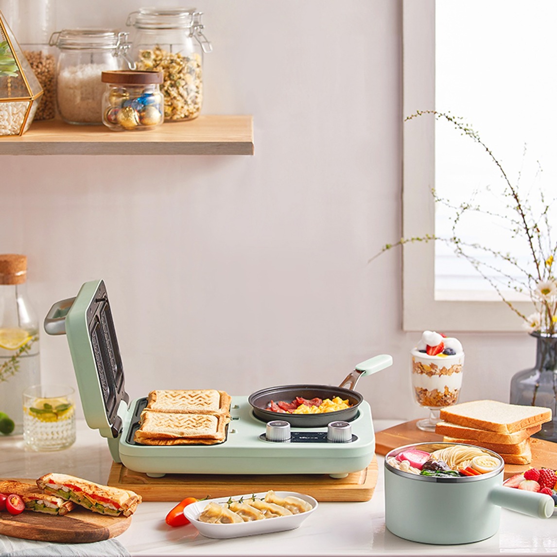 三明治机+煮锅+煎锅一体组合使用,中西式早餐组合搭配,煎煮烤烙都在行,双旋钮分区操作,方便一边烤三明治,一边煎蛋/煮面/熬粥……一人食丰富花样,2人食满足分量~