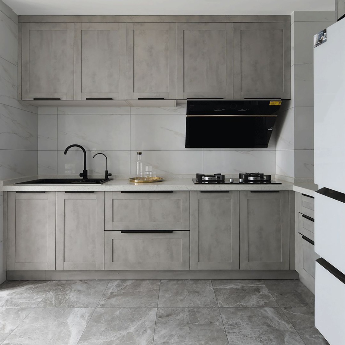 厨房主要以高级灰和爵士白为主,并添加了大理石和金属元素展示,为厨房打造了别致的下厨环境。另外厨房的地面还铺设了灰色哑光大理石瓷砖,与高级灰实木橱柜形成了融合关系,使整个空间呈现出简约的视觉效果。